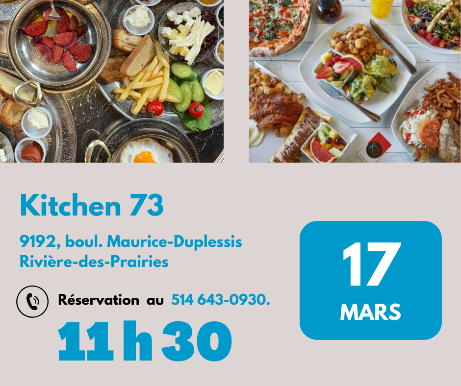 le mardi 17 mars 2026 à 11 h 30, au Kitchen 73, 9192, boul. Maurice-Duplessis, RDP.