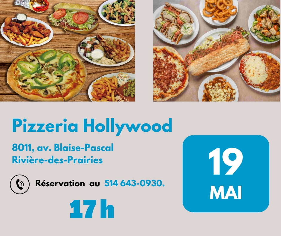 le mardi 19 mai 2026 à 17 h, à la pizzeria Hollywood, 8011, av. Blaise-Pascal, RDP.